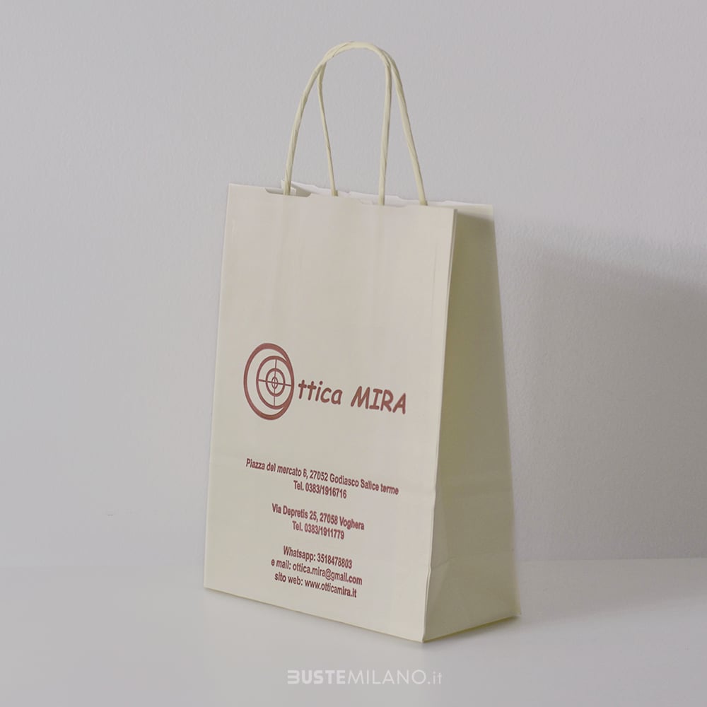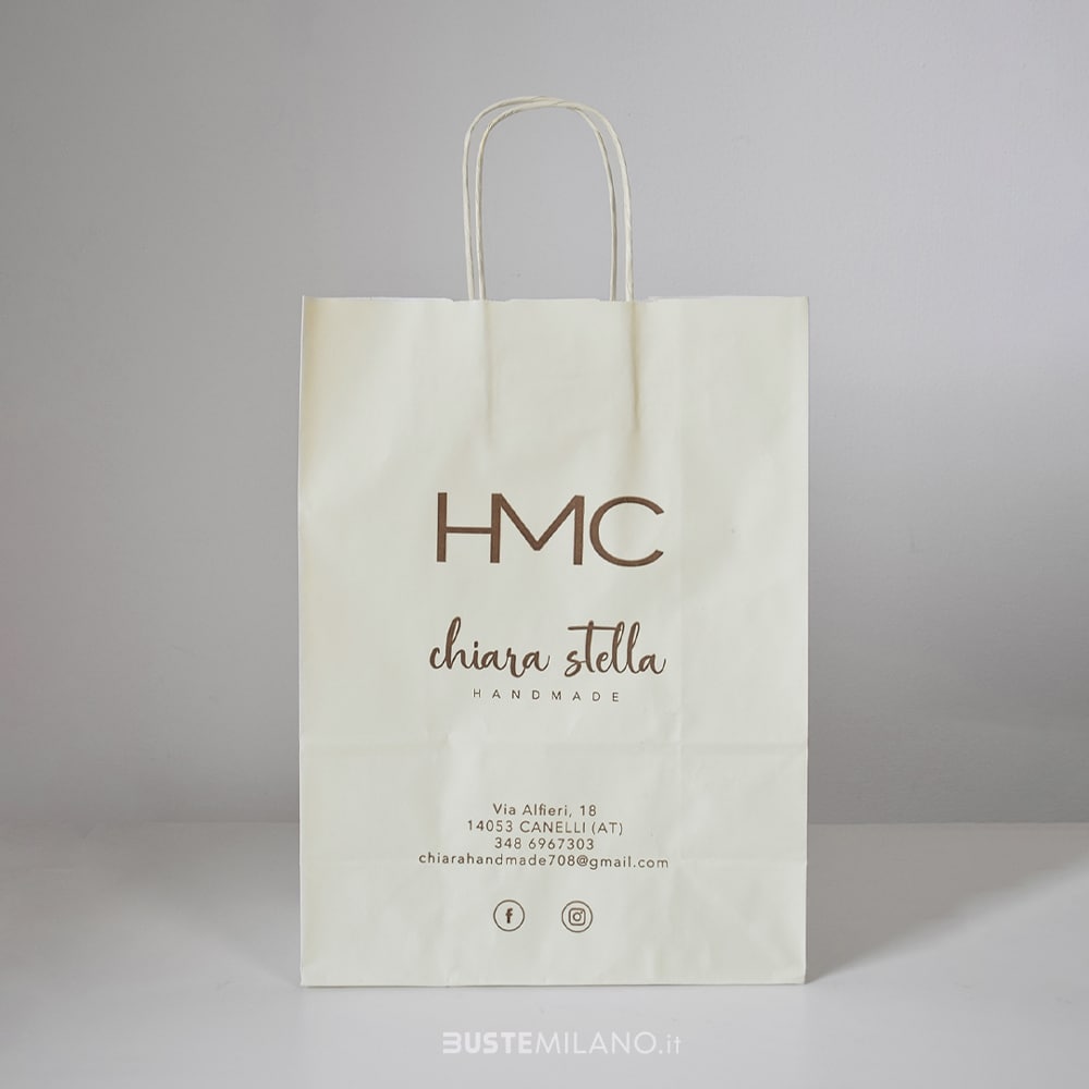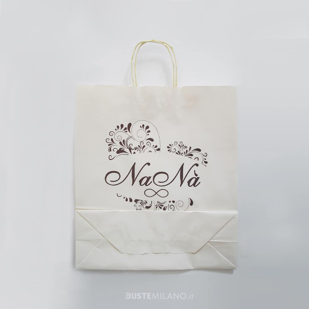 Shopper in Carta Kraft bianca con manico in cordino ritorto in tinta con il sacchetto.