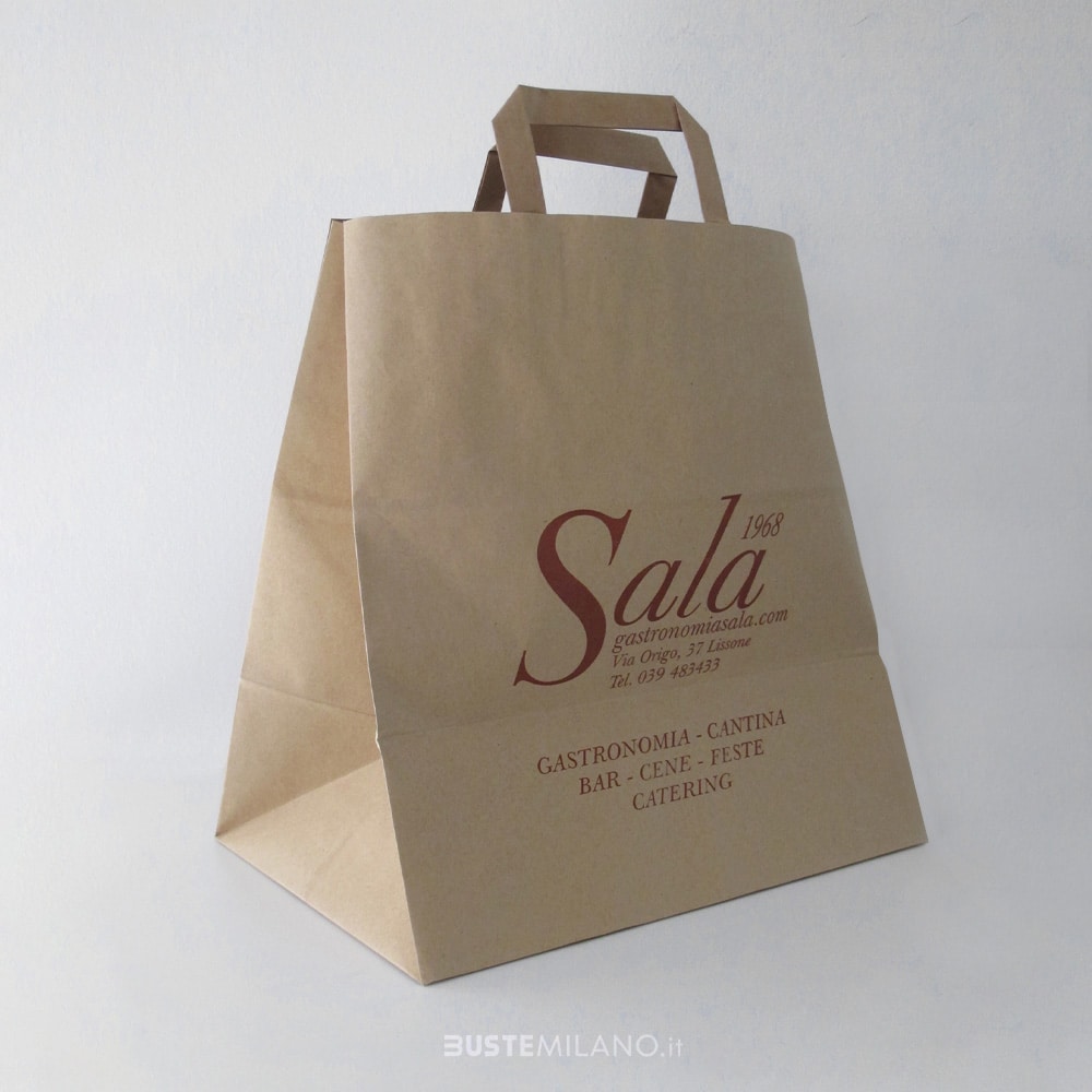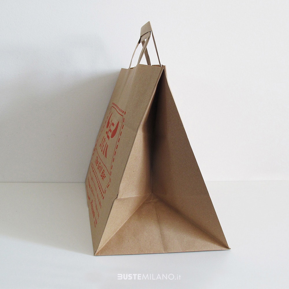 Realizzate in carta Kraft riciclata da 110 grammi, sono resistenti e durevoli, ideali per il food deli- very e per il trasporto sicuro di scatole e vassoi. Le comode maniglie in carta piatta, coordinate al colore del sacchetto, ne facilitano il trasporto. Le buste in carta avana sono la scelta ideale per chi ha a cuore la salvaguardia dell’ambiente, poiché sono prodotte con materiali riciclati e completamente riciclabili dopo l’uso.