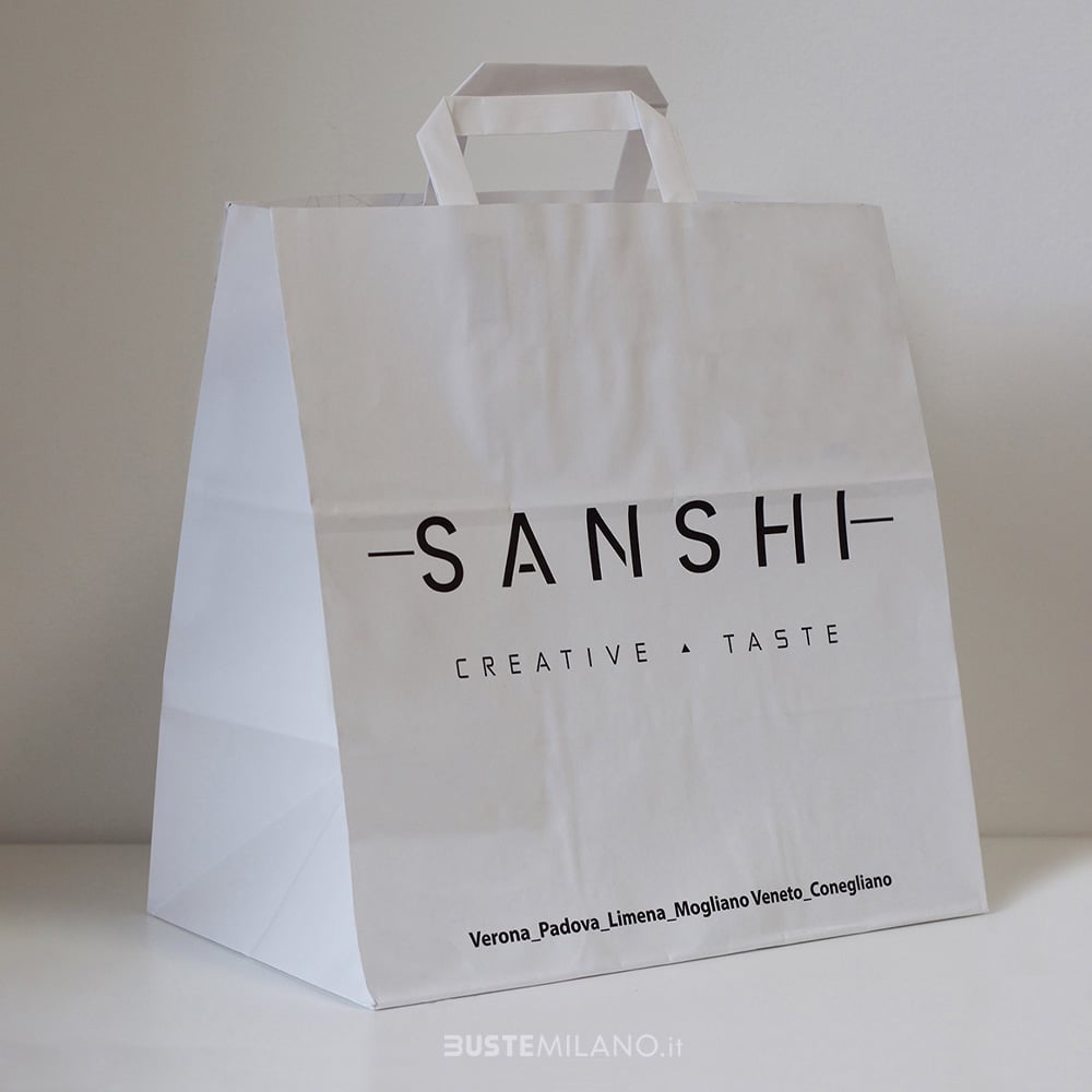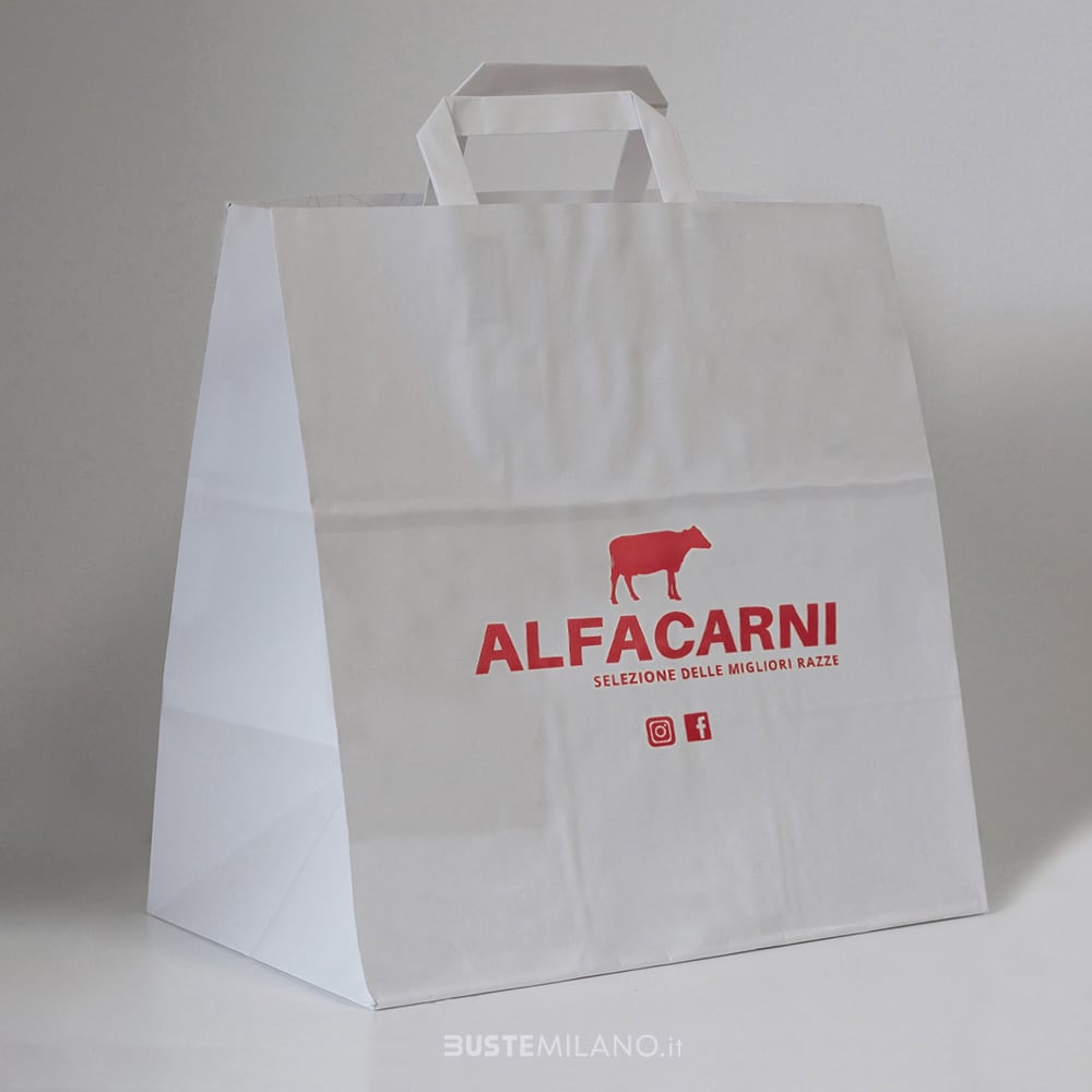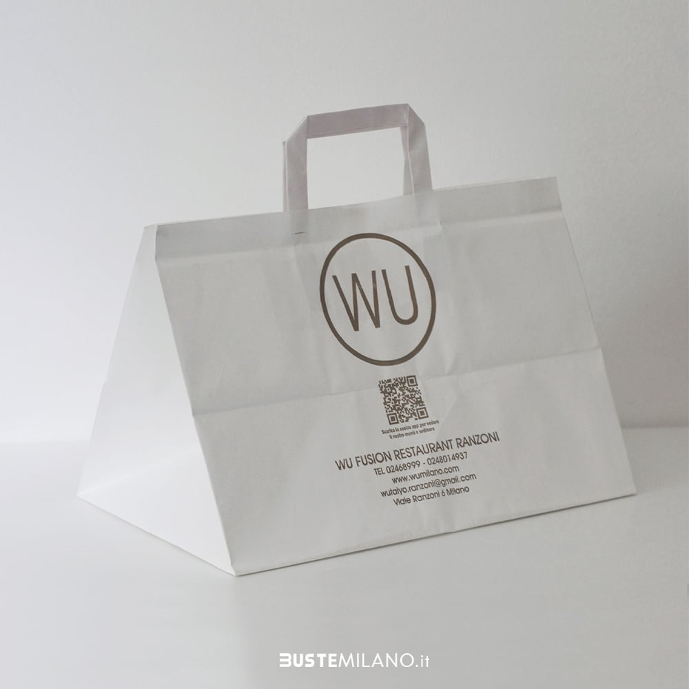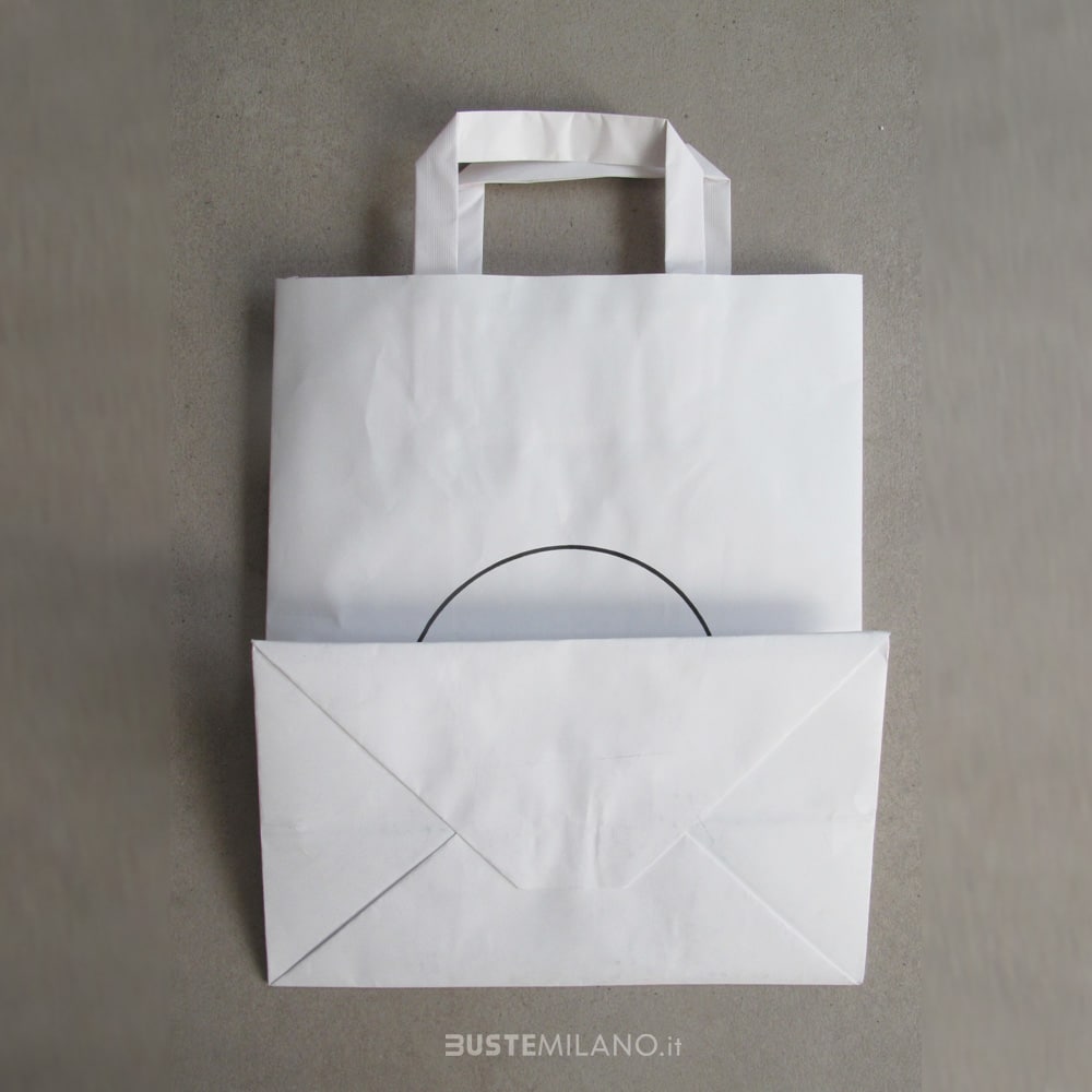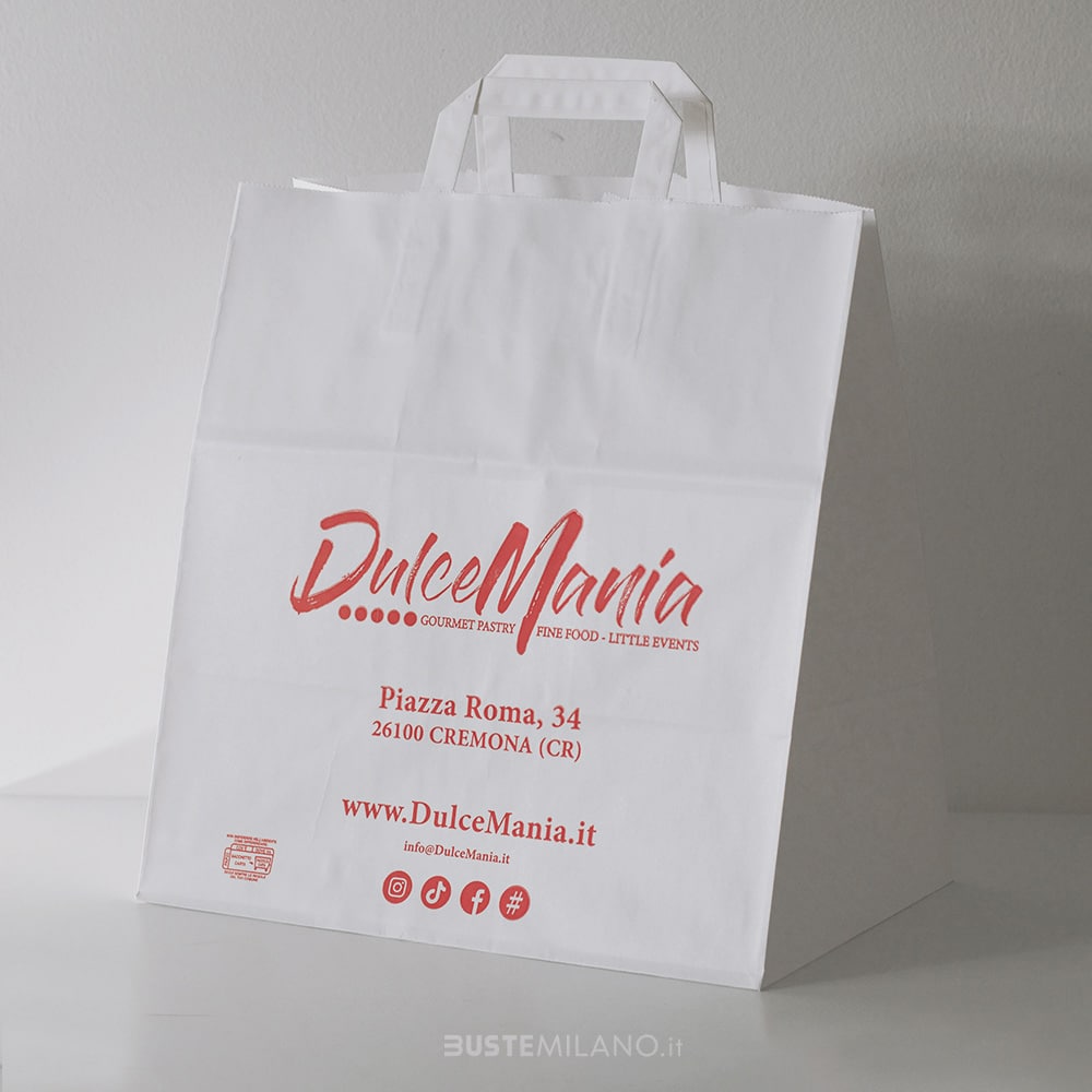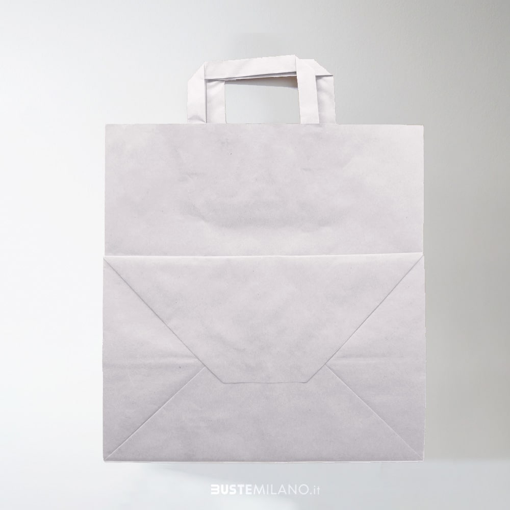 Realizzate in carta Kraft da 110 grammi, sono resistenti e durevoli, ideali per il food delivery e per il trasporto sicuro di scatole e vassoi. Le comode maniglie in carta piatta, abbinate al colore del sacchetto, assicurano un trasporto pratico e confortevole. La superficie bianca è ideale per la personalizzazione, consentendo di aggiungere loghi o informazioni della tua attività per una visibilità ottimale.