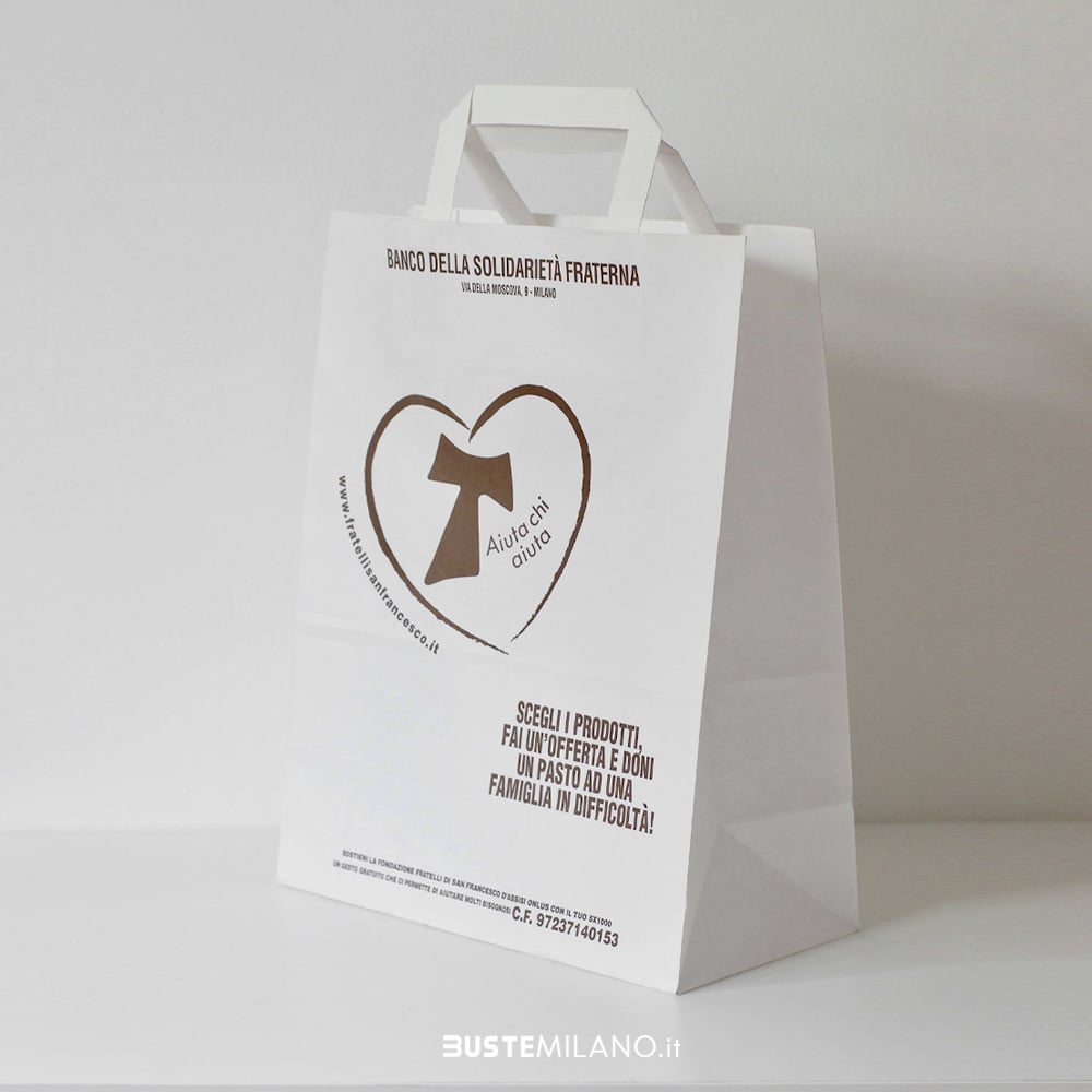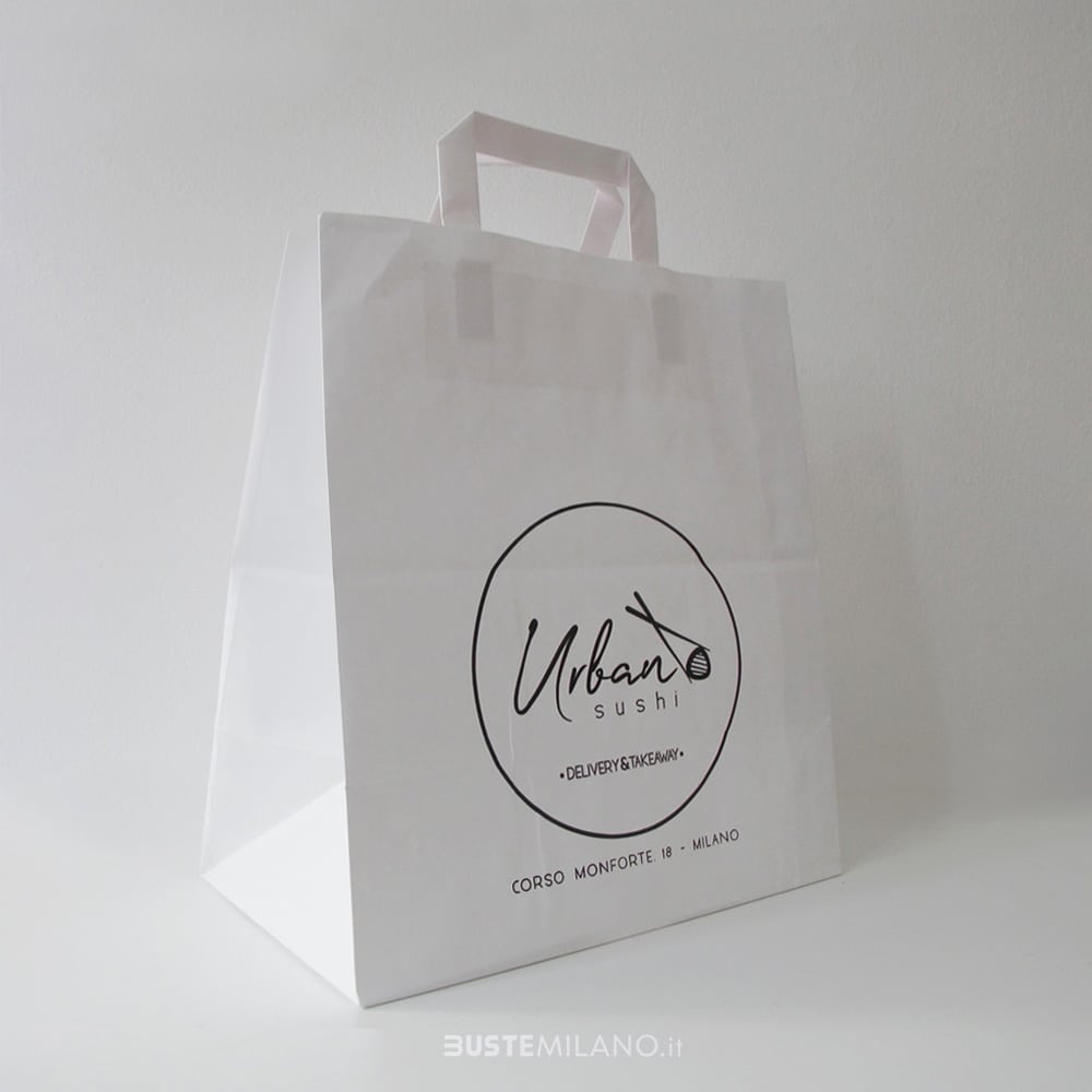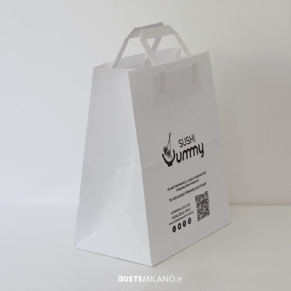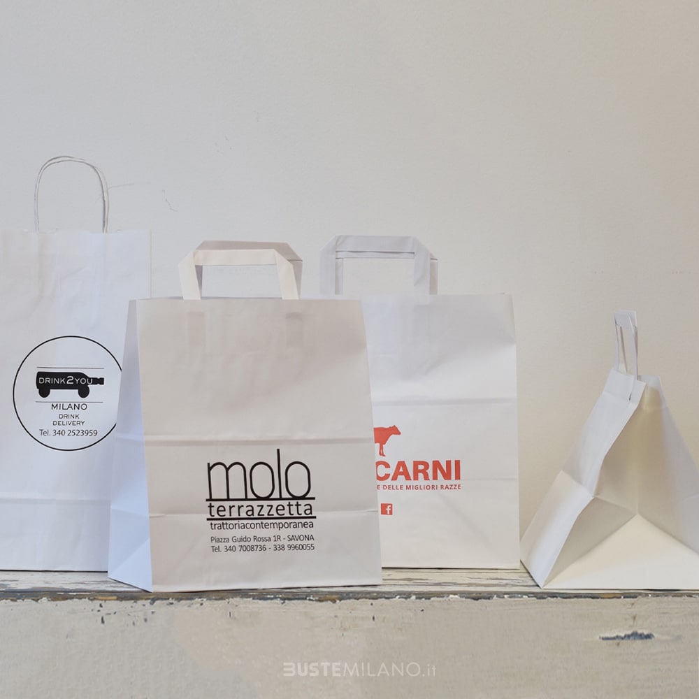 Le comode maniglie in carta piatta, coordinate al colore del sacchetto, ne facilitano il trasporto. Il colore bianco crea una superficie perfetta per la personalizzazione di loghi o informazioni della tua attività, garantendo massima visibilità.