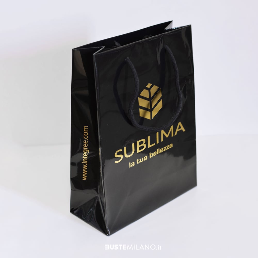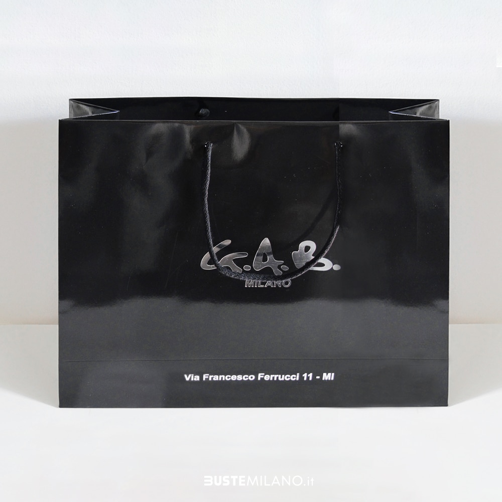 Shopper Carta Lusso finitura lucida Nera, tinta unita con manici in cotone. Queste buste resistenti ed eleganti sono ideali per molti tipi di negozio: boutique, accessori, intimo, gioielleria, articoli da regalo. I sacchetti plastificati rappresentano anche un ottimo veicolo di marketing durante fiere, attività promozionali o eventi. La plastificazione lucida accentua la brillantezza, il manico in cotone l’eleganza e il cartoncino sul fondo la resistenza. Disponibili in diversi formati, sia verticali che orizzontali.