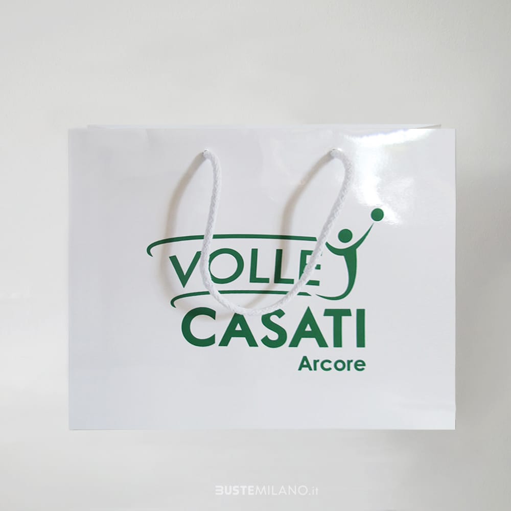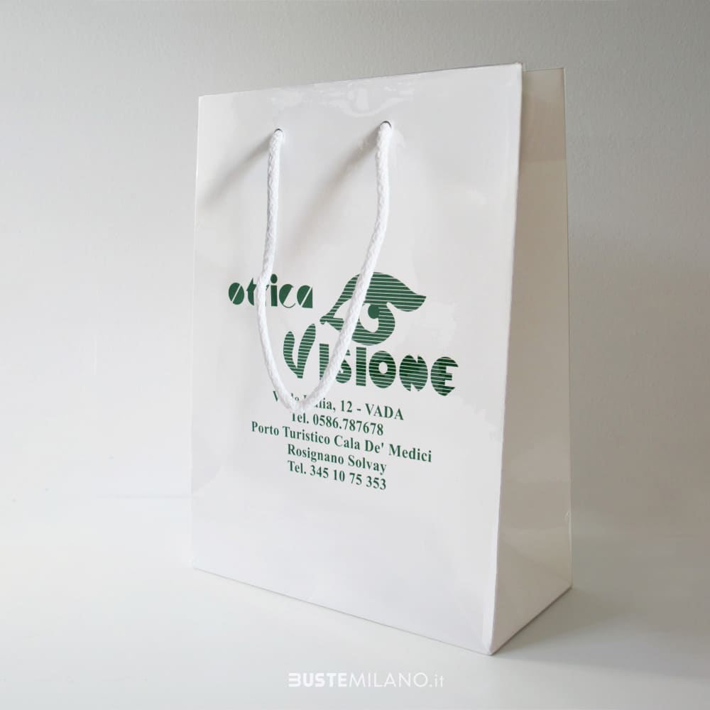 Shopper Carta Lusso finitura lucida Bianca, tinta unita con manici in cotone. Queste buste resistenti ed eleganti sono ideali per molti tipi di negozio: boutique, accessori, intimo, gioielleria, articoli da regalo. I sacchetti plastificati rappresentano anche un ottimo veicolo di marketing durante fiere, attività promozionali o eventi. La plastificazione lucida accentua la brillantezza, il manico in cotone l’eleganza e il cartoncino sul fondo la resistenza. Disponibili in diversi formati, sia verticali che orizzontali.