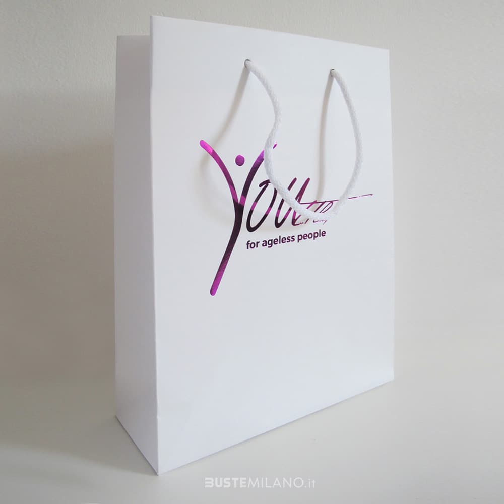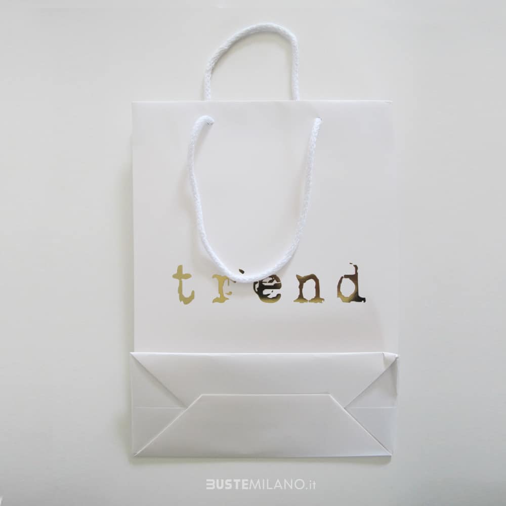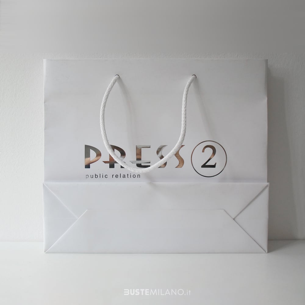 Shopper Carta Lusso finitura opaca Bianca, tinta unita con manici in cotone. Queste buste resistenti ed eleganti sono ideali per molti tipi di negozio: boutique, accessori, intimo, gioielleria, articoli da regalo. I sacchetti plastificati rappresentano anche un ottimo veicolo di marketing durante fiere, attività promozionali o eventi. La plastificazione opaca accentua la raffinatezza, il manico in cotone l’eleganza e il cartoncino sul fondo la resistenza. Disponibili in diversi formati, sia verticali che orizzontali.