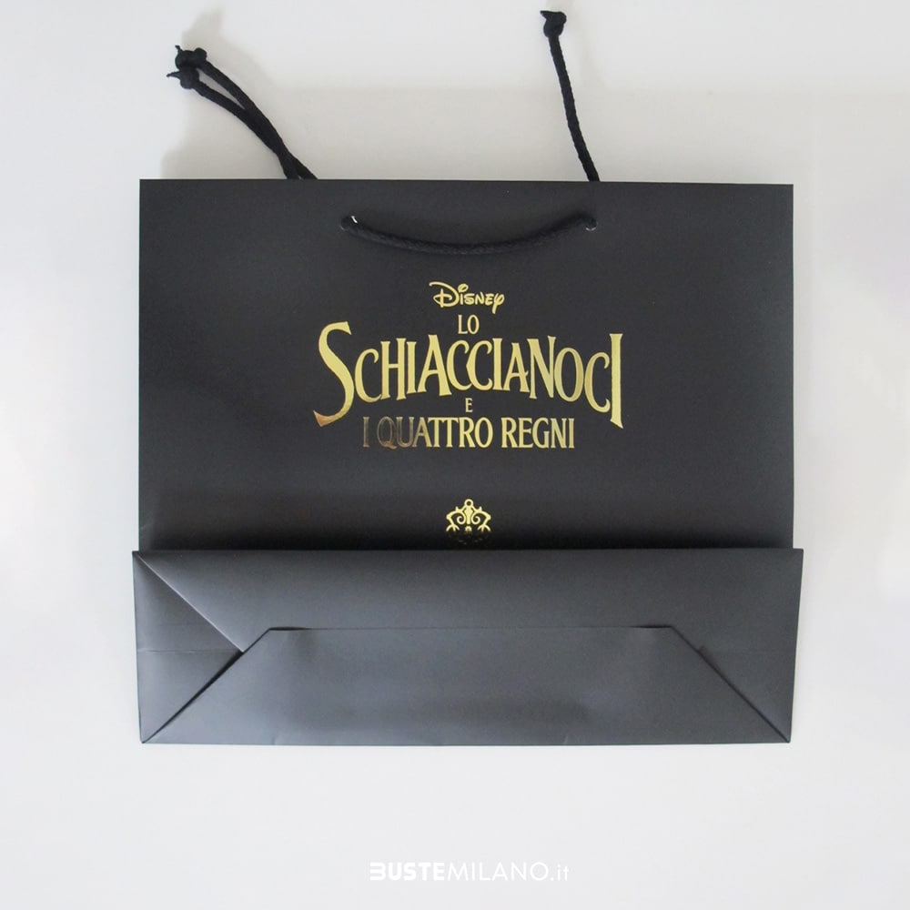 Shopper Carta Lusso finitura opaca nera, tinta unita con manici in cotone. Queste buste resistenti ed eleganti sono ideali per molti tipi di negozio: boutique, accessori, intimo, gioielleria, articoli da regalo. I sacchetti plastificati rappresentano anche un ottimo veicolo di marketing durante fiere, attività promozionali o eventi. La plastificazione opaca accentua la raffinatezza, il manico in cotone l’eleganza e il cartoncino sul fondo la resistenza. Disponibili in diversi formati, sia verticali che orizzontali.